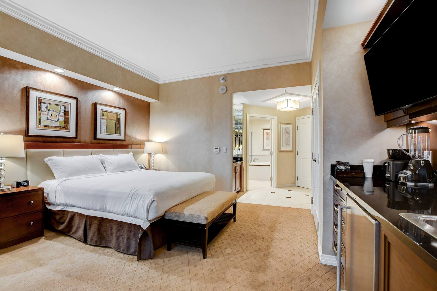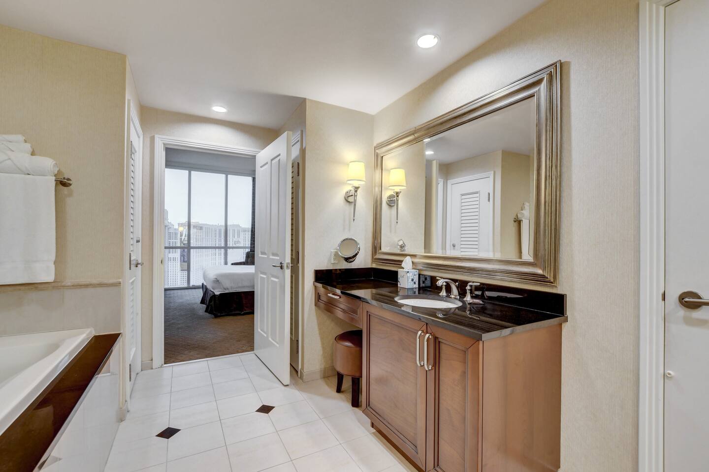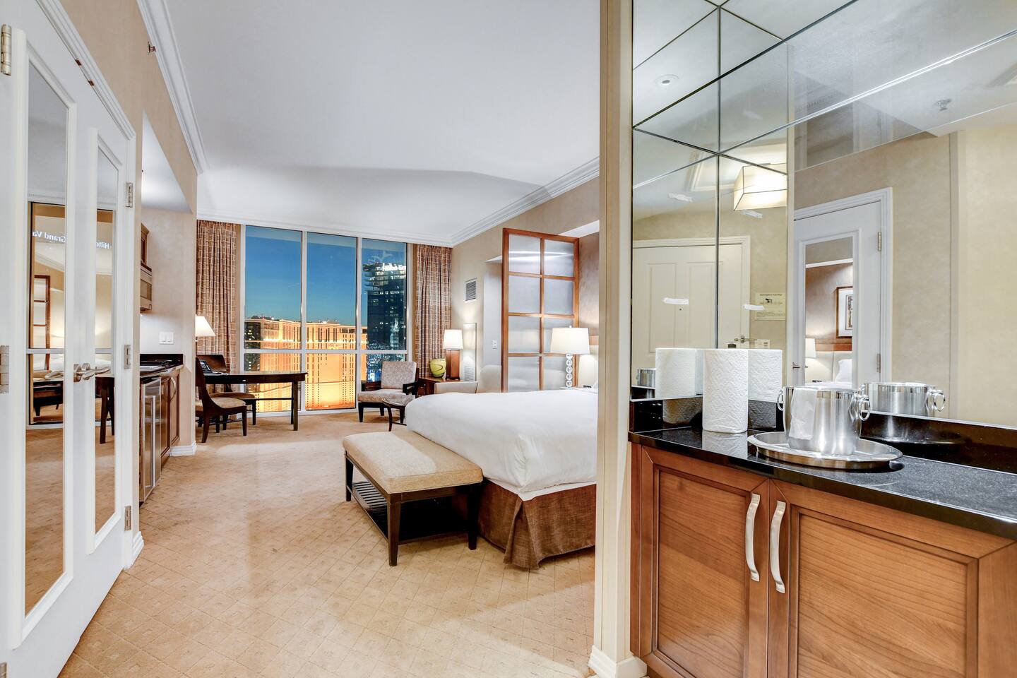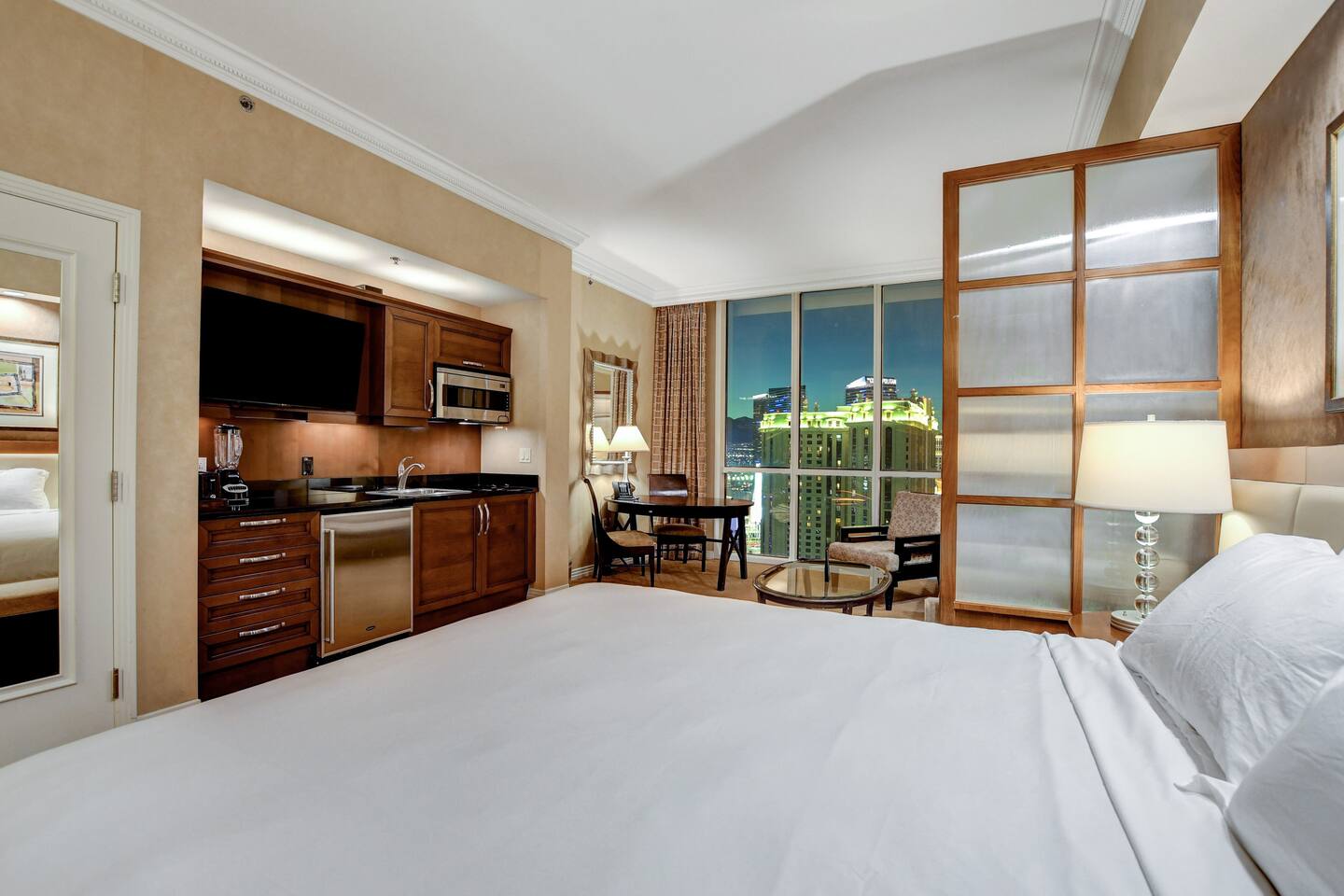 *Beautiful Condo at Signature MGM *Access to ALL MGM Amenities – No Additional Cost *5-minute Walk to Strip - Underground Tunnel *Stunning views *Cozy 1-bedroom Condo + Adjoining separate entrance Studio *Two king beds Total – 1 in each suite *2 pull-out Queen beds Total – 1 in each suite *Fully Equipped Kitchen + Living Room *Access to Pools, Vibrant Lounges, & Fitness Facilities *Plush Bedding *24/7 Security & Valet Parking Included *Topgolf Next Door *Starbucks in Tower 1