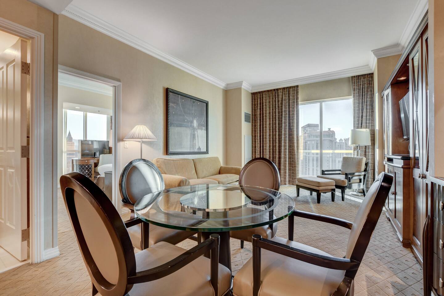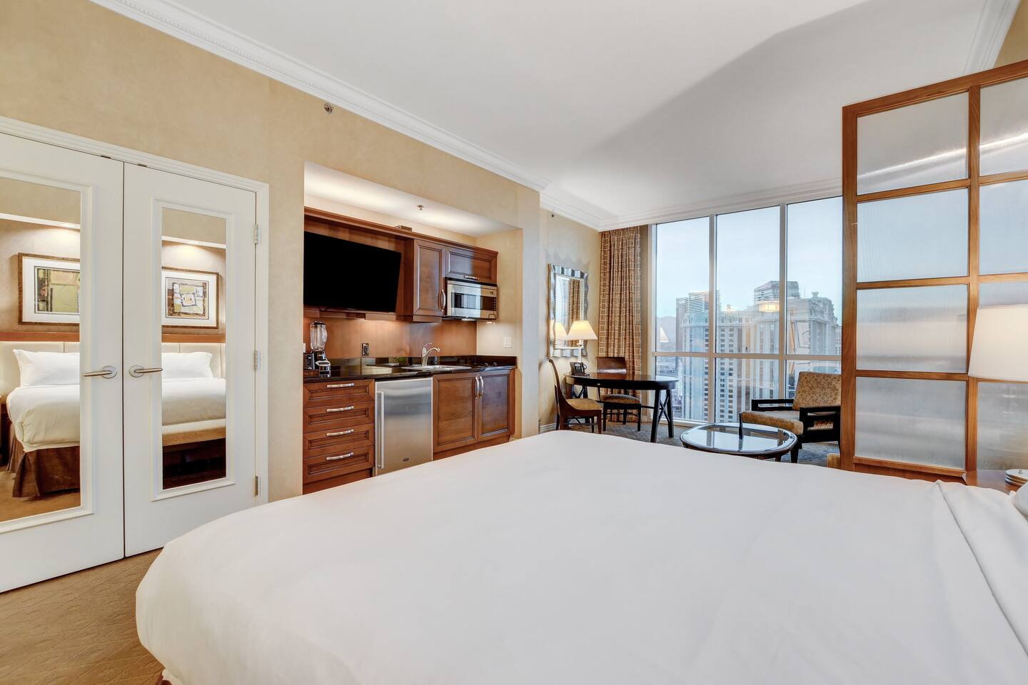Welcome to our extraordinary Penthouse with Direct Views of the iconic Las Vegas Strip. This space offers Luxury and Comfort. There are 2 spacious Bedrooms. Each featuring a plush king bed and a pullout sofa. Inside each room you can find 2 grand bathrooms with Jacuzzi Tubs and Showers. Along with a 3rd bathroom and shower. Ample space for relaxation and rejuvenation. One-bedroom unit includes a Full Kitchen with New Appliances. While the adjoining studio features a convenient Kitchenette with a mini-Fridge. There is a Door Separating the studio from the bedroom. Allowing for the Option to enjoy 3 Private Sleeping Areas Or Open.