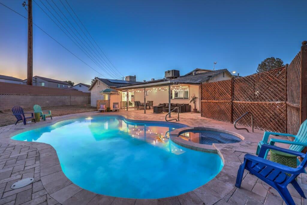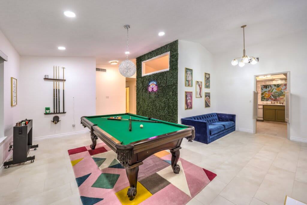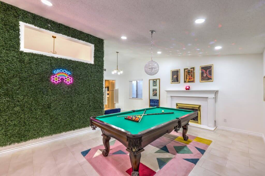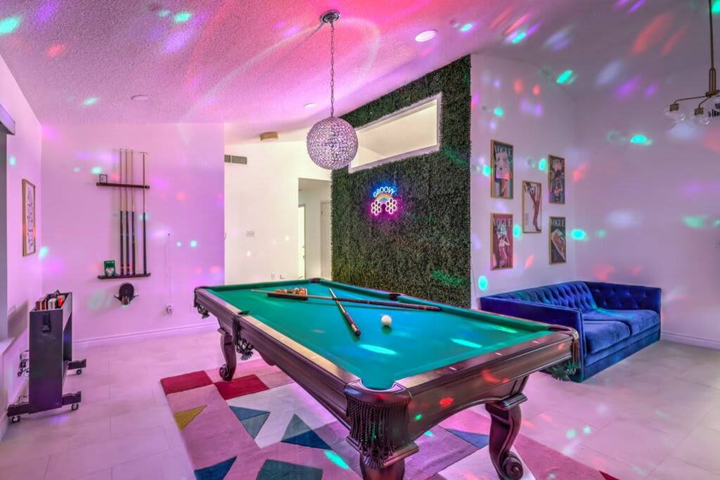 ☞ Pickleball court ☞ Basketball court ☞ Huge heated pool and spa (pool heating available upon request for $100 a night) ☞ Plenty of outdoor seating for lounging in the backyard ☞ Billiards table ☞ 70s vogue-themed nook with Vogue magazine covers from the 70s, perfect for taking IG photos and capturing memories ☞ Musical hall of fame wall showcasing 70s legends ☞ Rotating disco ball to set the mood ☞ Clark County STVR License #: 2007540