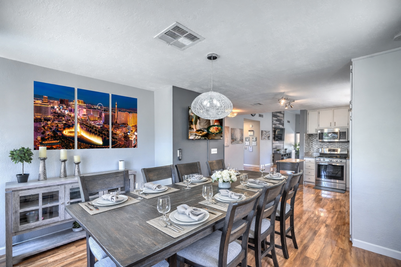 Heated Pool Oasis, 15 minutes to the Las Vegas STRIP Located just 15 minutes from the iconic Las Vegas Strip, this vibrant and spacious four-bedroom home offers the ideal base for families, friends, or groups looking to enjoy all that Las Vegas has to offer. ✧ SLEEPING ARRANGEMENTS ✧ - Primary Suite: King Bed - Bedroom 2: Queen Bed - Bedroom 3: Two Twin Beds - Bedroom 4: Queen Bunk Bed with Full Bed Below ✧ HIGHLIGHTS ✧ - Private Backyard Oasis: Relax in a serene outdoor setting complete with a covered patio, outdoor dining area, and a sparkling pool. The heated pool provides year-round comfort, while the spacious yard is perfect for lounging or casual games. - Entertainment Options: Enjoy a dedicated billiards room and comfortable lounge areas throughout the home. Six flat-screen TVs and high-speed Wi-Fi with access to major streaming platforms ensure you stay connected and entertained. - Fully Equipped Kitchen: Prepare meals with ease in the spacious kitchen, featuring stainless steel appliances, a large island, and all essential cookware. - Great Amenities: The primary bedroom features a cozy electric fireplace and tasteful design touches for a relaxing retreat. Fresh linens, plush towels, and essential toiletries are included for your convenience. - Whether you’re exploring the nightlife of the Strip or simply enjoying a peaceful escape, this home offers the best of both worlds—comfort, convenience, and style. Book your stay today and enjoy your Vegas getaway in comfort and style.