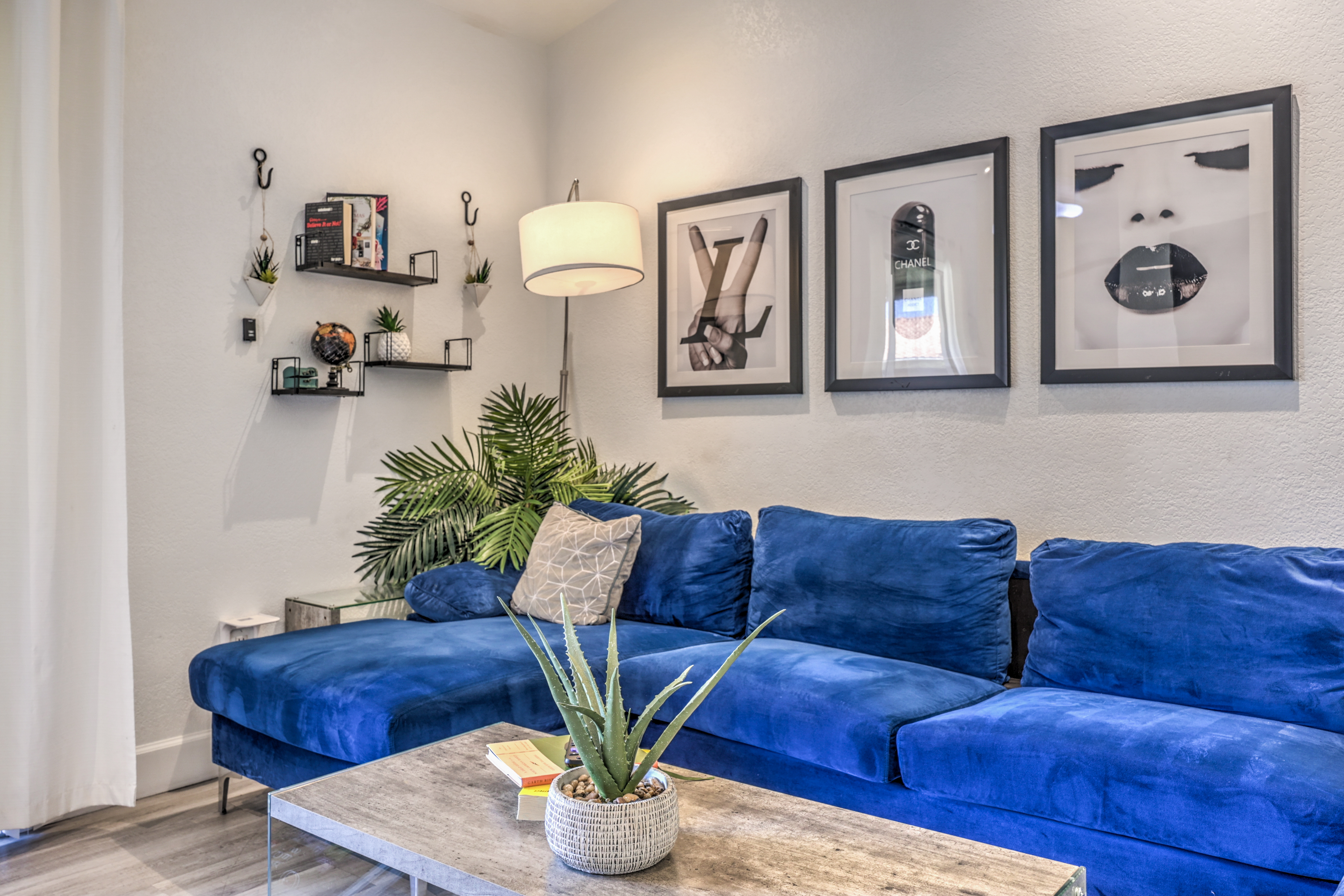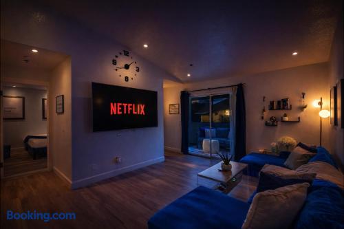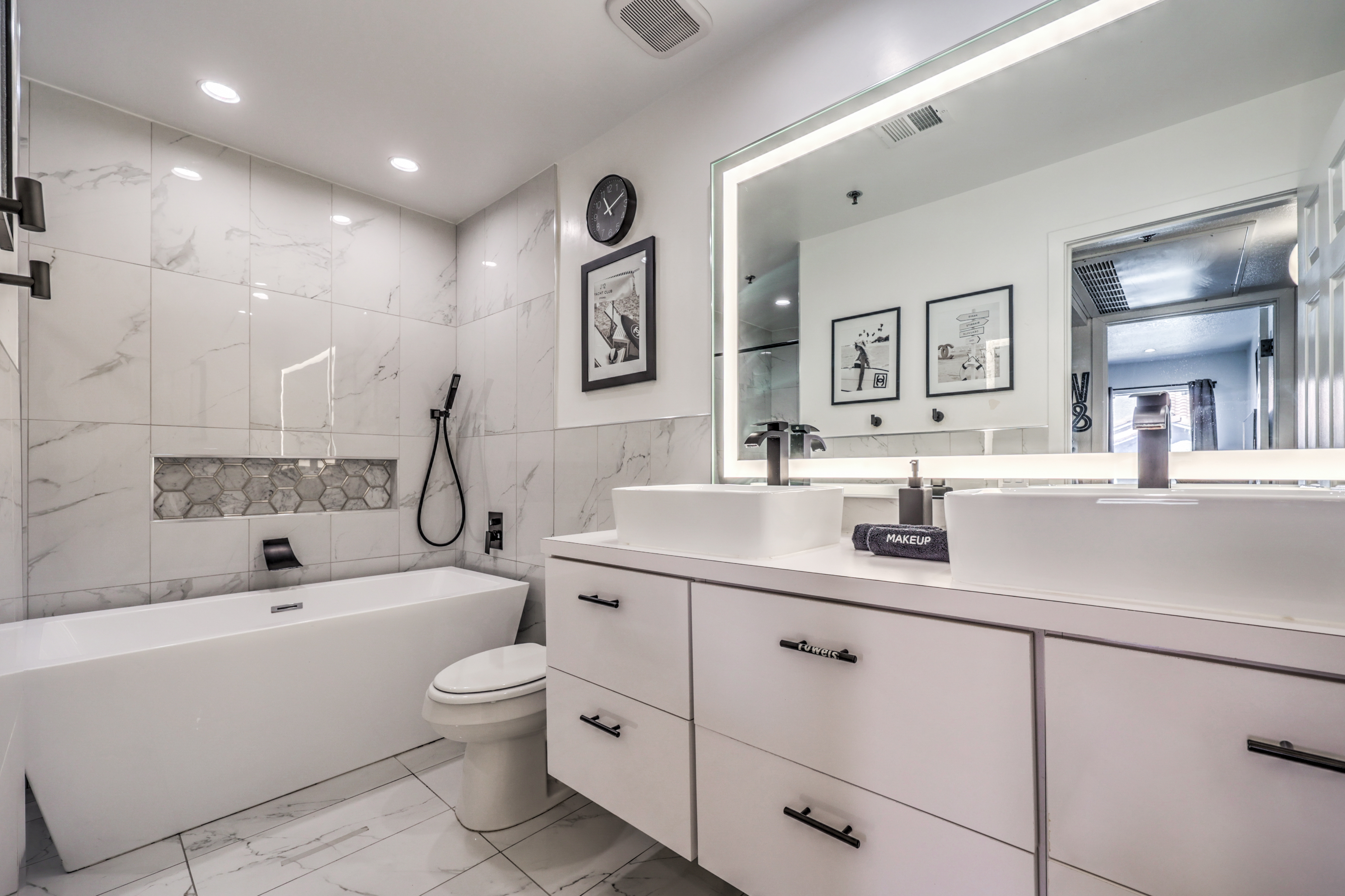 Escape to your beautiful modern condo, offering a private and stylish experience with more space and value than a hotel. The bright, clean living area features a plush, royal blue velvet sectional sofa perfect for relaxing in front of the large, wall-mounted Roku TV. The open-plan space includes a full kitchen with a black island counter, stainless steel appliances, and everything you need to feel at home. Your group will sleep comfortably with our flexible arrangements: Two Private Master Suites: Each includes a large king-size bed and its own attached master bathroom. Additional Sleeping: We provide two foldable twin beds and one ottoman that converts into a bed. Key Amenities: Fully equipped kitchen with stainless steel appliances Two full-size rain showers One full-size “Honeymoon” bathtub Private in-home laundry unit with supplies provided Large Roku Smart TV for streaming