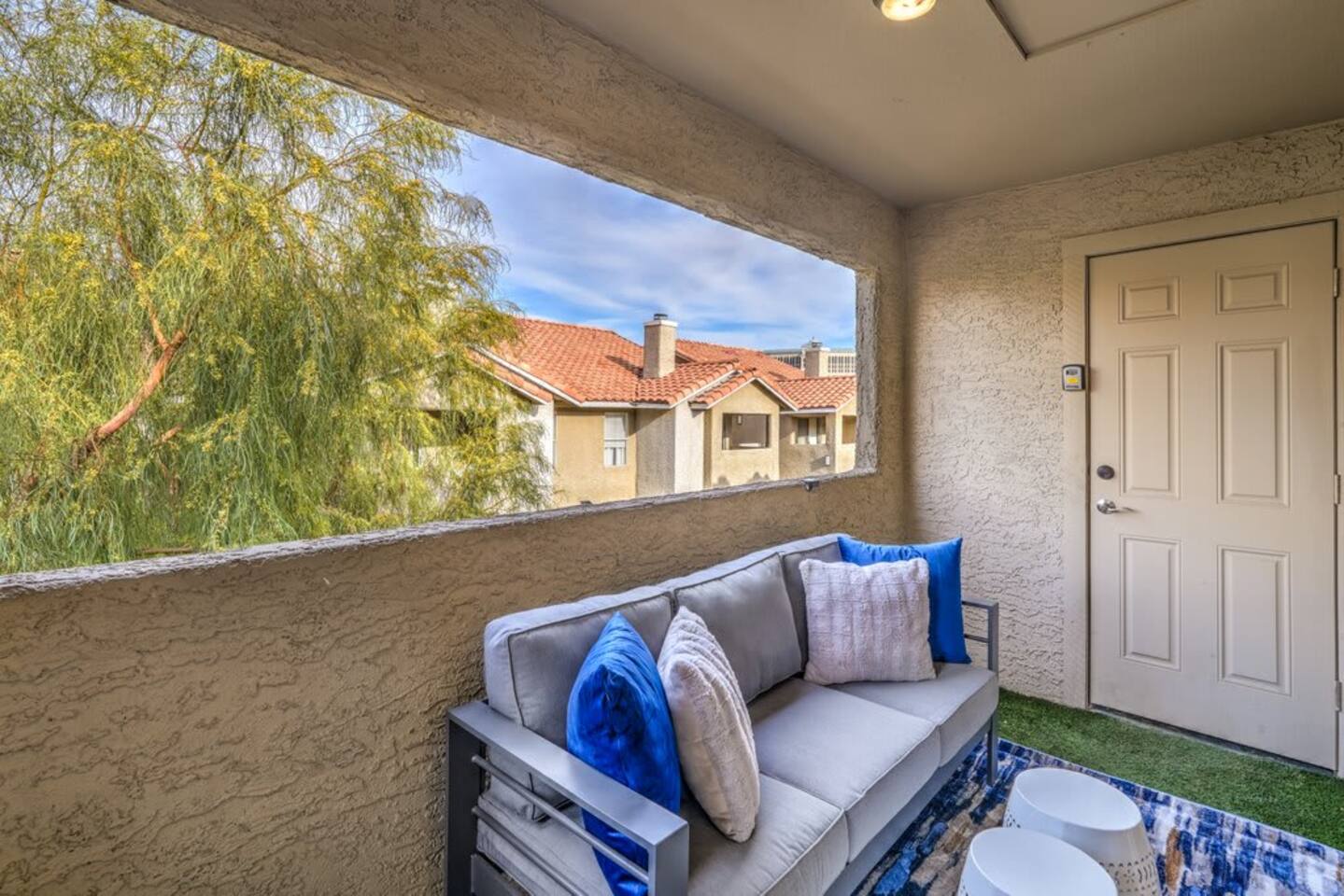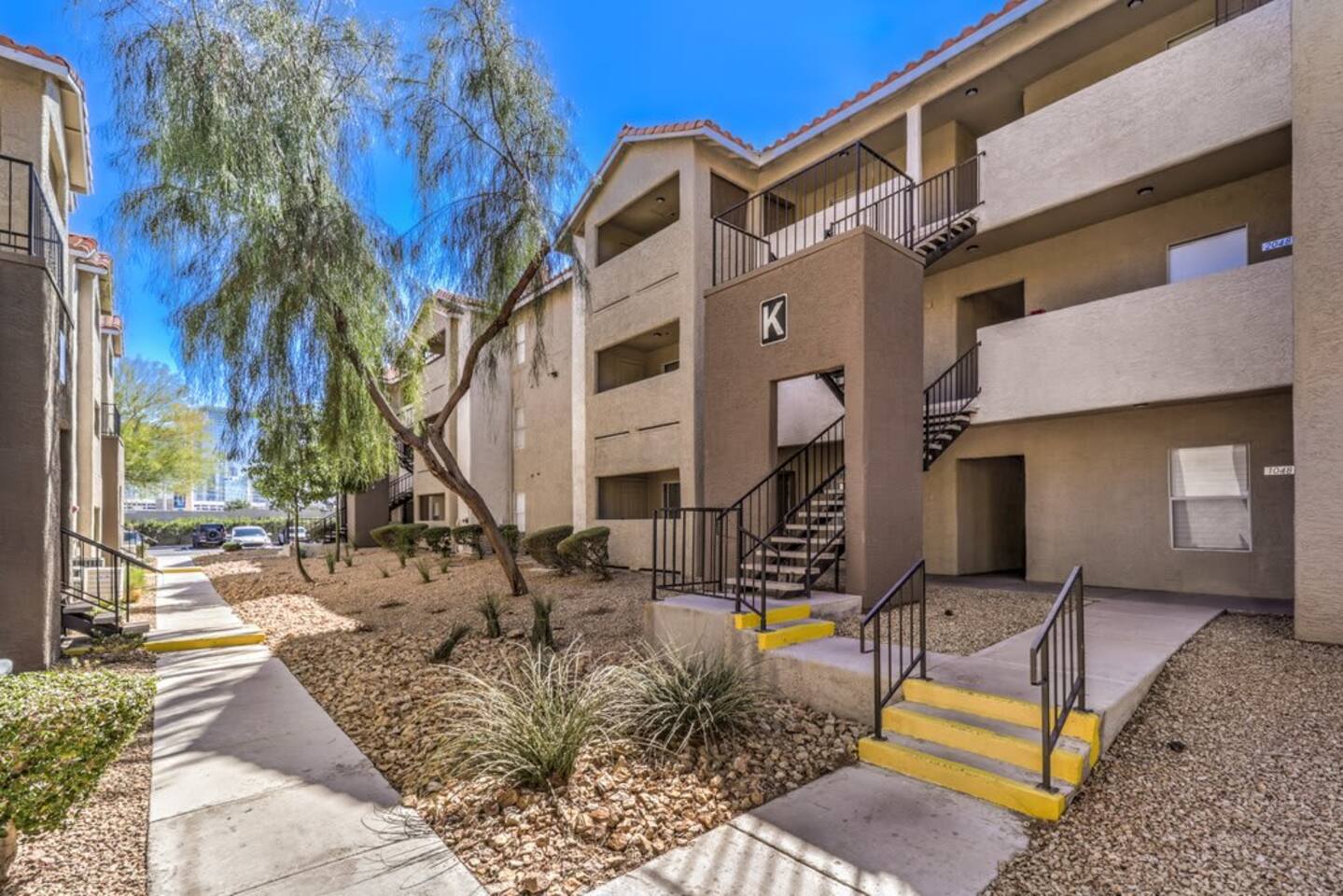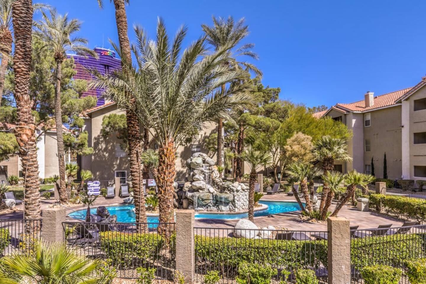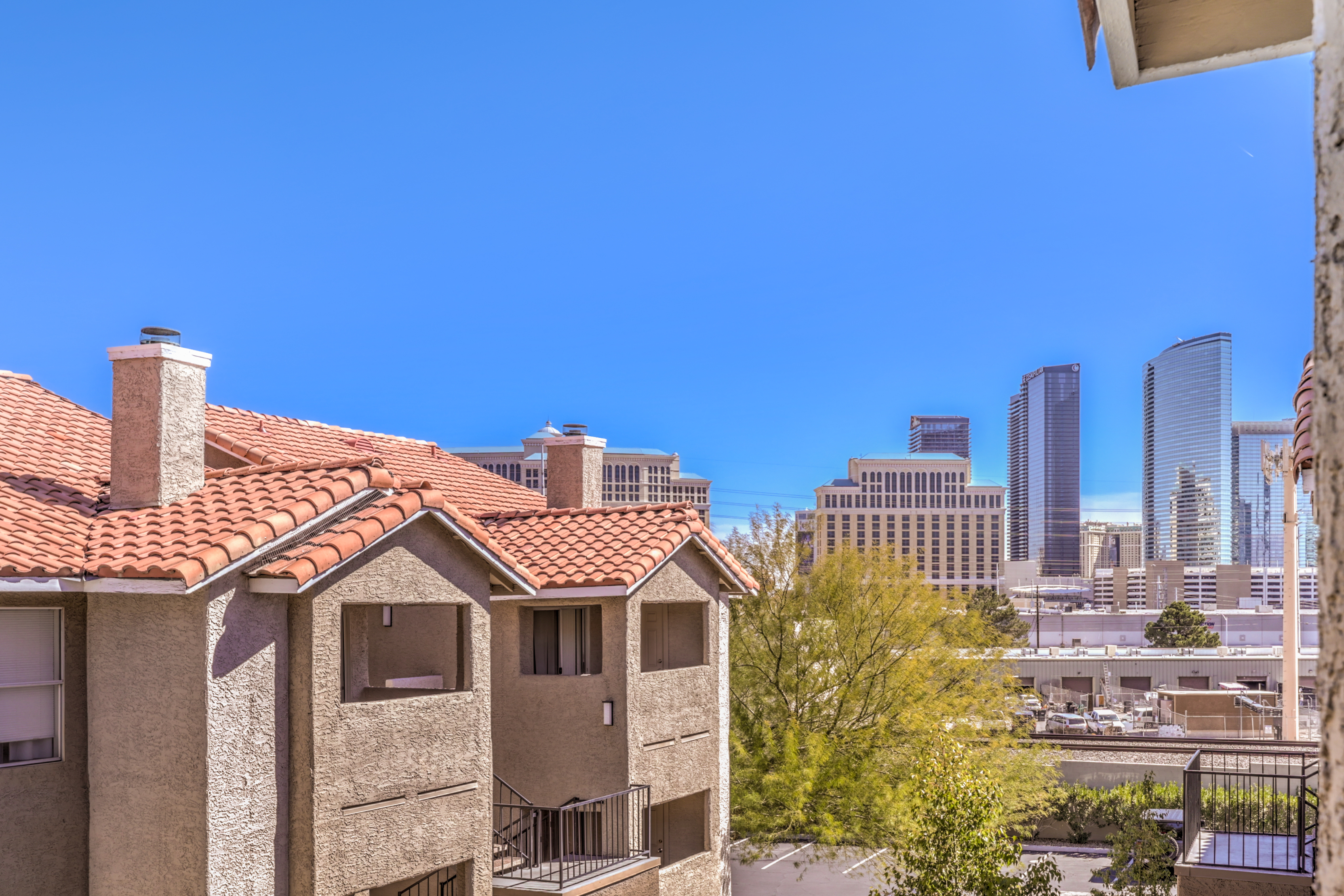 We are located in a quiet safe neighborhood just off the strip. 6 min walk to the Palms & Rio Casinos, ChicK-Fil-A, Denny, Walgreens & Public Transportation. • 7 Minutes Drive / $10 Uber ride to the heart of the strip. • 24/7 security guards patrol around the clock.