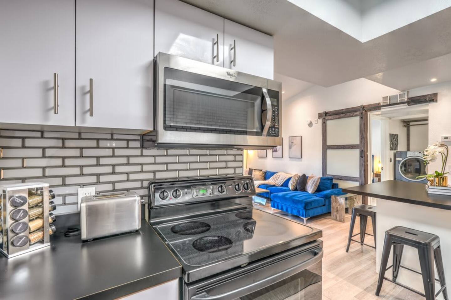 • In-Home Laundry Unit (includes all supplies) • Check-in Starts at 4 PM (Early Check-in, Ask for Availability) • Ring Front Door Bell for Guest Security • Pets fee ($125 deep cleaning pet fee required many guest are allergic) * There are two folding twin beds, and one ottoman that turns into a bed available for guests.