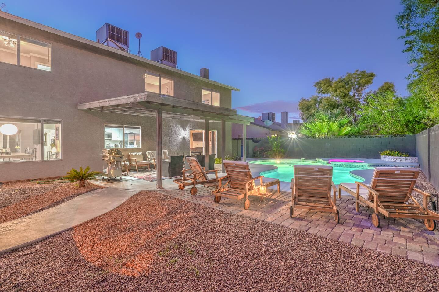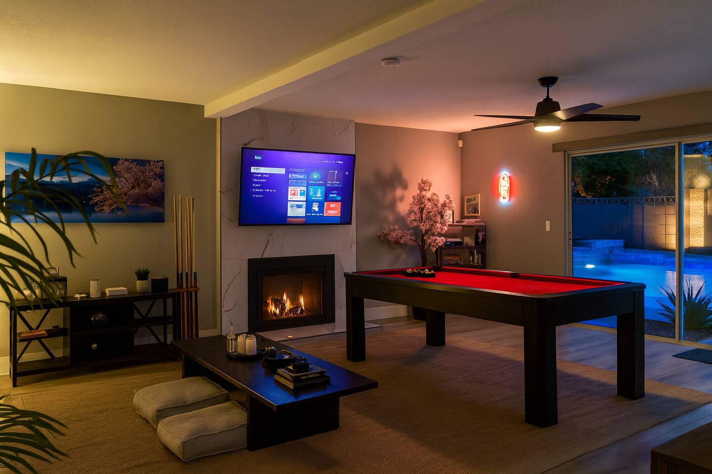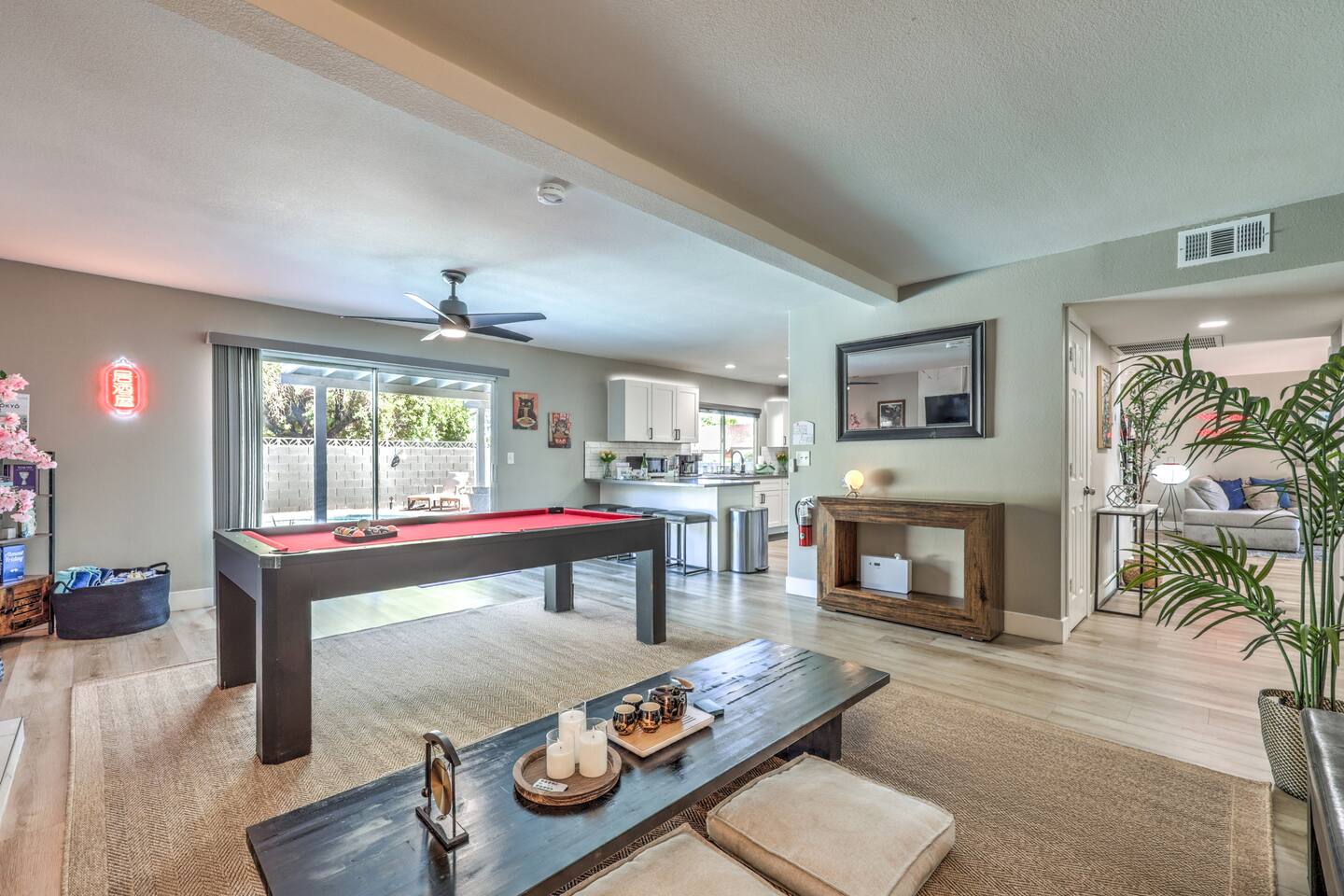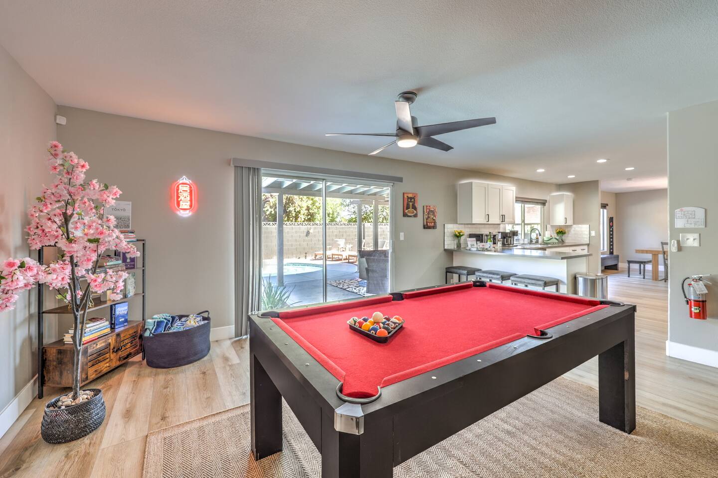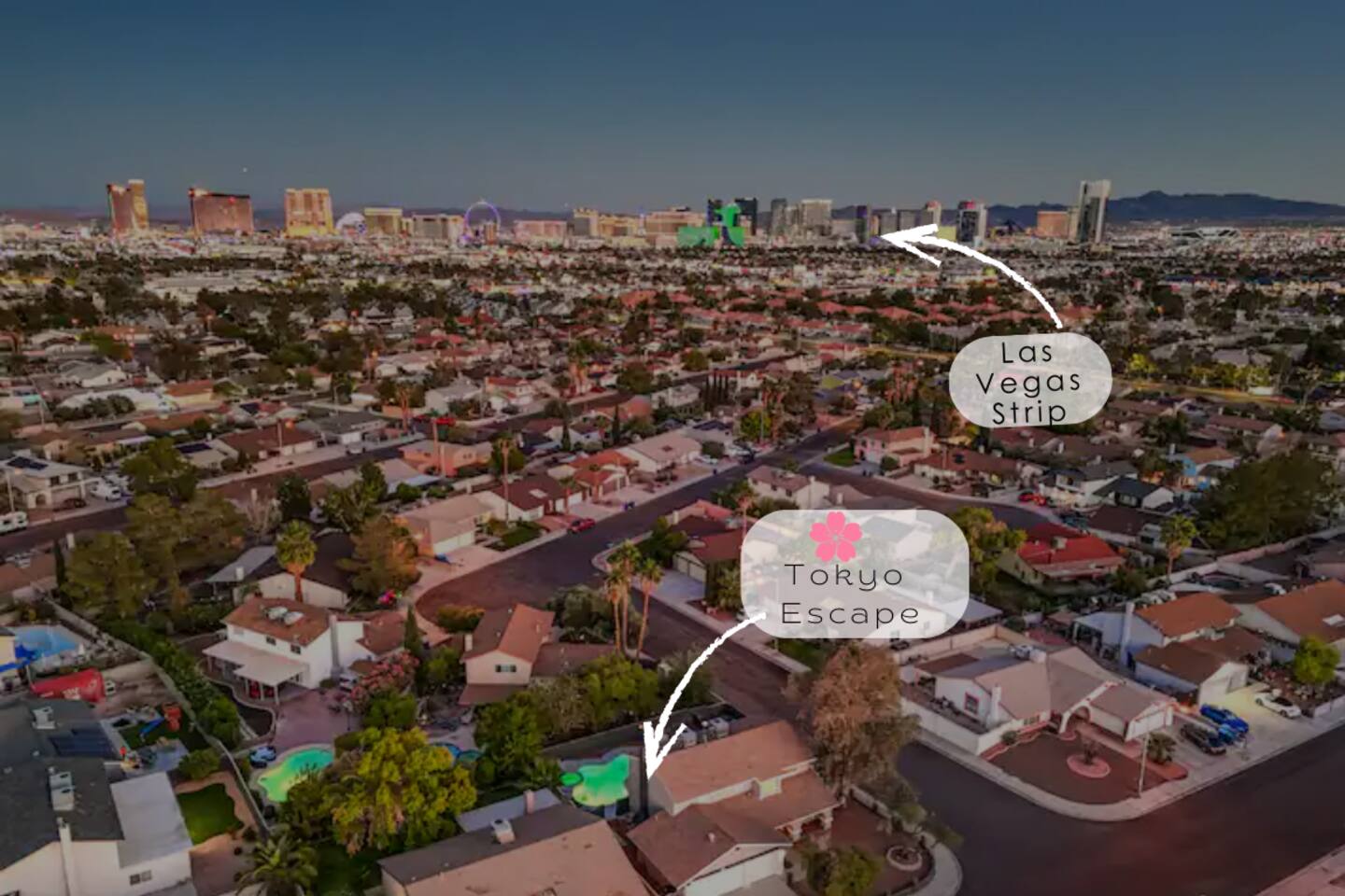 🌸 Tokyo Escape 逃避 Your Modern Las Vegas Retreat Step into Tokyo Escape, a one-of-a-kind Las Vegas sanctuary inspired by the serenity of Japan and the vibrancy of Tokyo nightlife. Designed for families, friends, and groups, this four-bedroom home blends modern luxury with peaceful zen energy — complete with a heated pool & spa, open living spaces, and a dog-friendly outdoor area for your furry companions. ✨ Highlights 2,163 sq ft of thoughtfully designed living space 4 bedrooms | 2.5 bathrooms | 8 beds | Sleeps up to 10 Modern kitchen with stainless steel appliances Japanese tea room for meditation, relaxation, or a casual billiards match — complete with Smart TV Family room with large sectional and 75" Smart TV for movie nights Private heated pool & spa with lounge chairs + covered patio (Ask about pool heating or jacuzzi options) Fenced dog run and relief area – pet-friendly with approval In-home washer & dryer for extended stays Free parking + RV space Minutes from The Strip & Las Vegas Chinatown (150+ restaurants!) 🛏 Themed Rooms & Sleeping Arrangements: 1) The Shrine (Primary Suite): King bed + twin daybed, Smart TV, ensuite bath with double vanity & soaking tub — a true zen garden retreat. Kimonos provided for complimentary use. 2) Bedroom 2 – Shinjuku Suite: Queen bed with moody neon lighting for a sleek, Tokyo-style escape. 3) Bedroom 3 – Samurai Room: Twin-over-full bunk + kids’ play corner inspired by traditional Japan. 4) Bedroom 4 – Anime Room: Twin bed + twin trundle (2 beds) — playful and colorful with anime art. Fresh towels, toiletries & half bath on main floor provided. 🍹 Explore & Experience Just minutes away, explore the best of Las Vegas culture, cuisine, and entertainment: 🎰 Casinos & Shows: The STRAT, Wynn, Resorts World, Caesars, Bellagio & more 🌸 Food & Nightlife: Lotus of Siam, Tacos El Gordo, The Golden Tiki, Barry’s Downtown Prime 🏮 Las Vegas Chinatown: 150+ restaurants, markets & nightlife — only 5 minutes away 🎡 Family Fun: AREA15, Adventuredome, The Venetian gondolas 🌿 Your Escape Awaits Unwind in the heated spa, sip tea in the Tatami room, or enjoy a serene night under the stars. Tokyo Escape is where the tranquility of Japan meets the excitement of Las Vegas — the perfect balance of calm and connection.