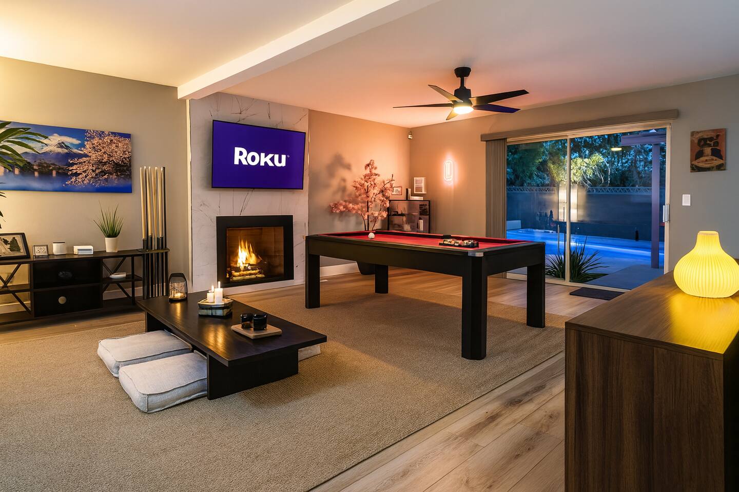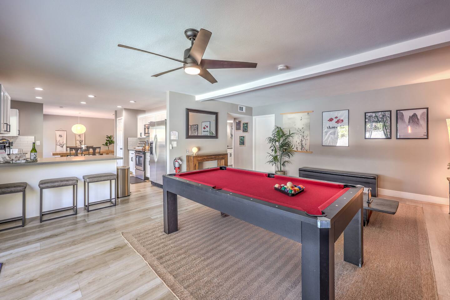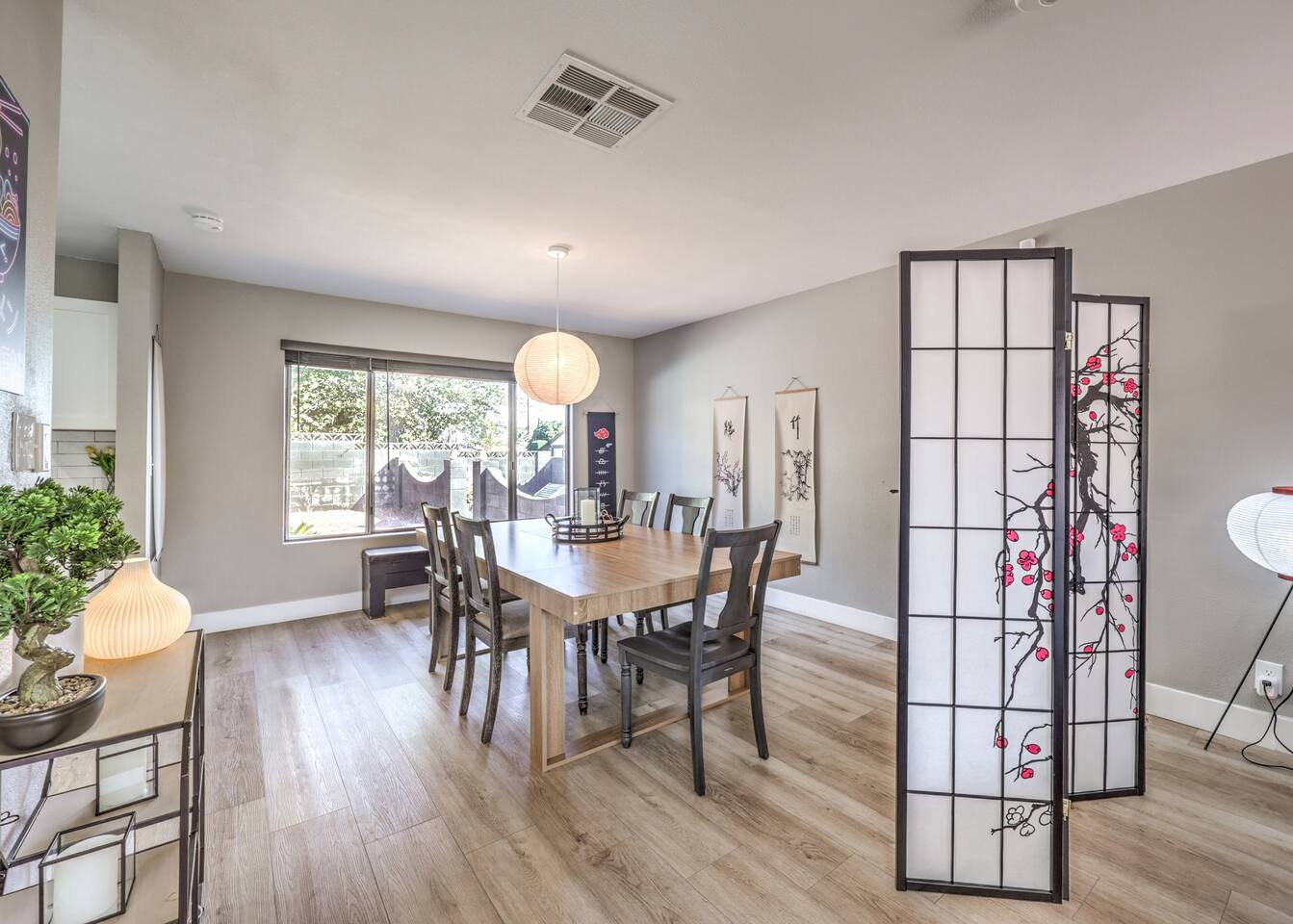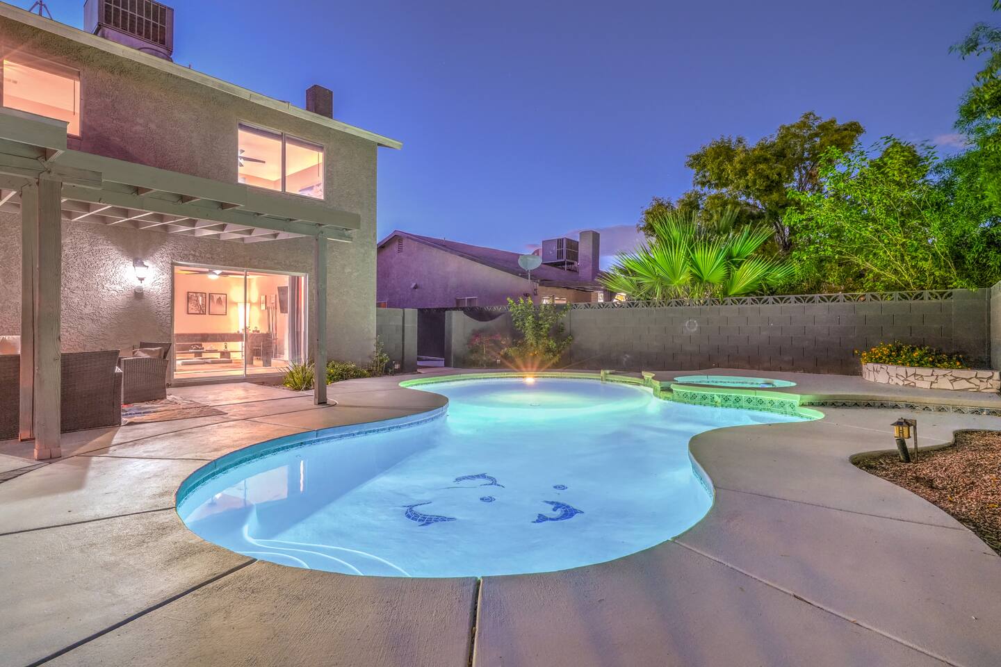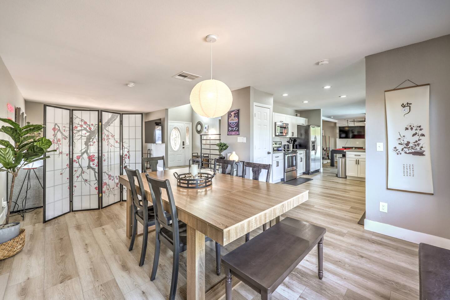 🌸 Tokyo Escape 逃避 Your Modern Las Vegas Retreat Step into Tokyo Escape, a one-of-a-kind Las Vegas sanctuary inspired by the serenity of Japan and the vibrancy of Tokyo nightlife. Designed for families, friends, and groups, this four-bedroom home blends modern luxury with peaceful zen energy — complete with a heated pool & spa, open living spaces, and a dog-friendly outdoor area for your furry companions. ✨ Highlights 2,163 sq ft of thoughtfully designed living space 4 bedrooms | 2.5 bathrooms | 8 beds | Sleeps up to 10 Modern kitchen with stainless steel appliances Japanese tea room for meditation, relaxation, or a casual billiards match — complete with Smart TV Family room with large sectional and 75" Smart TV for movie nights Private heated pool & spa with lounge chairs + covered patio (Ask about pool heating or jacuzzi options) Fenced dog run and relief area – pet-friendly with approval In-home washer & dryer for extended stays Free parking + RV space Minutes from The Strip & Las Vegas Chinatown (150+ restaurants!) 🛏 Themed Rooms & Sleeping Arrangements: 1) The Shrine (Primary Suite): King bed + twin daybed, Smart TV, ensuite bath with double vanity & soaking tub — a true zen garden retreat. Kimonos provided for complimentary use. 2) Bedroom 2 – Shinjuku Suite: Queen bed with moody neon lighting for a sleek, Tokyo-style escape. 3) Bedroom 3 – Samurai Room: Twin-over-full bunk + kids’ play corner inspired by traditional Japan. 4) Bedroom 4 – Anime Room: Twin bed + twin trundle (2 beds) — playful and colorful with anime art. Fresh towels, toiletries & half bath on main floor provided. 🍹 Explore & Experience Just minutes away, explore the best of Las Vegas culture, cuisine, and entertainment: 🎰 Casinos & Shows: The STRAT, Wynn, Resorts World, Caesars, Bellagio & more 🌸 Food & Nightlife: Lotus of Siam, Tacos El Gordo, The Golden Tiki, Barry’s Downtown Prime 🏮 Las Vegas Chinatown: 150+ restaurants, markets & nightlife — only 5 minutes away 🎡 Family Fun: AREA15, Adventuredome, The Venetian gondolas 🌿 Your Escape Awaits Unwind in the heated spa, sip tea in the Tatami room, or enjoy a serene night under the stars. Tokyo Escape is where the tranquility of Japan meets the excitement of Las Vegas — the perfect balance of calm and connection.