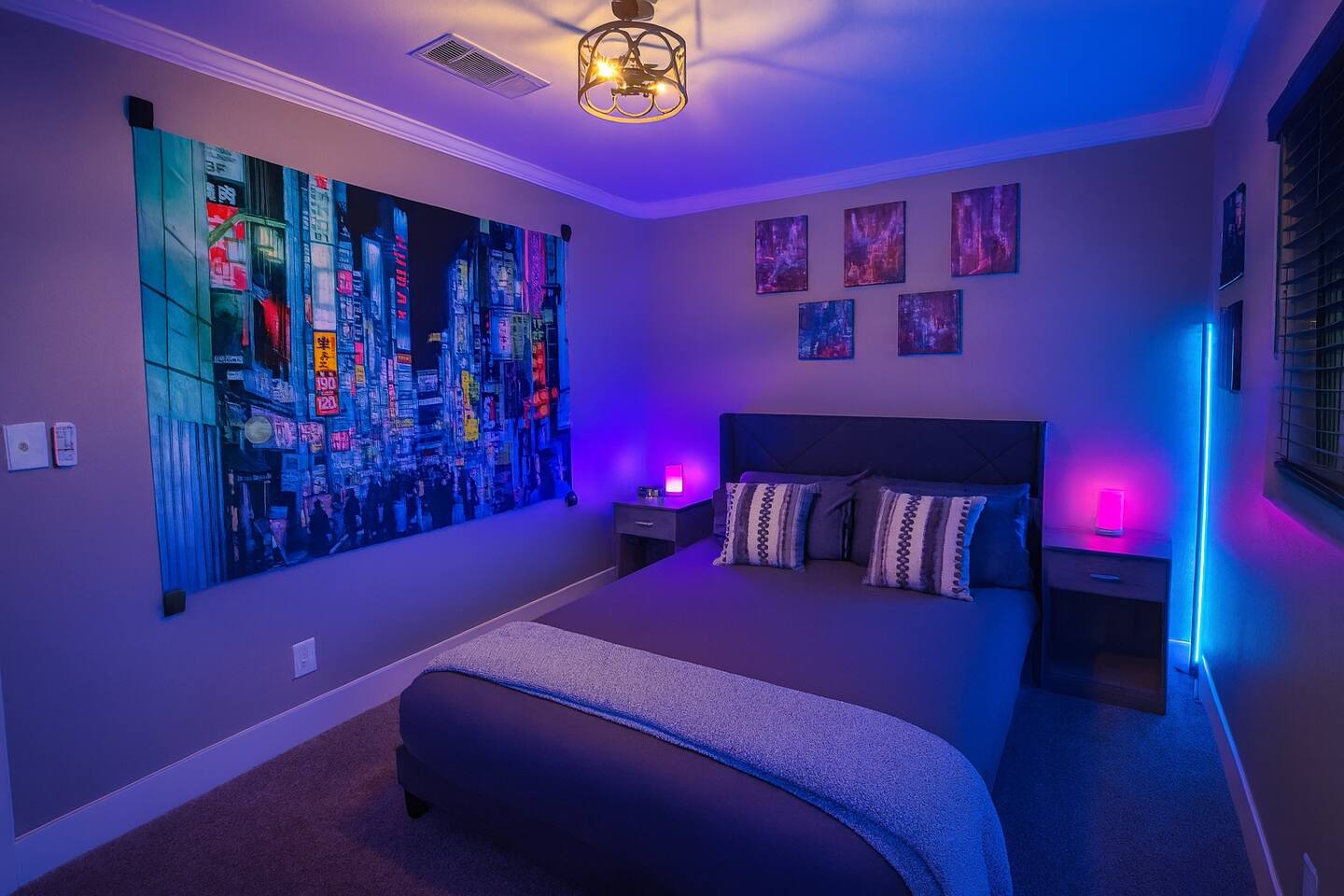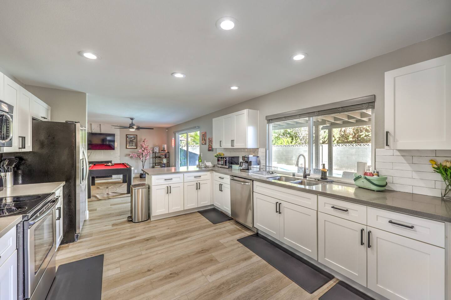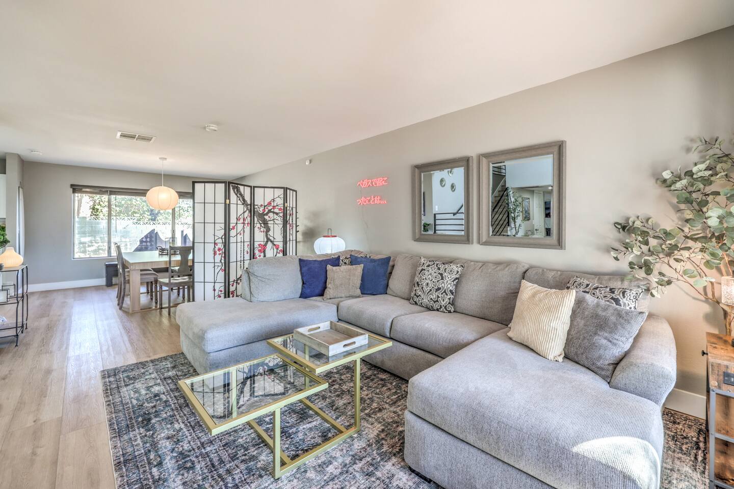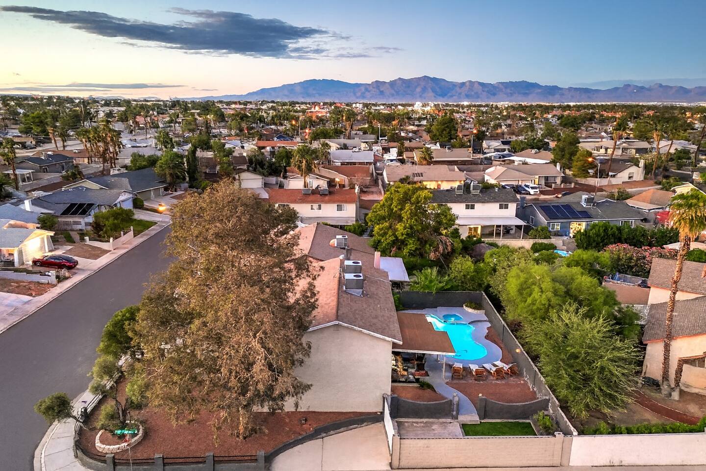 🌸 Tokyo Escape 逃避 Your Modern Las Vegas Retreat Step into Tokyo Escape, a one-of-a-kind Las Vegas sanctuary inspired by the serenity of Japan and the vibrancy of Tokyo nightlife. Designed for families, friends, and groups, this four-bedroom home blends modern luxury with peaceful zen energy — complete with a heated pool & spa, open living spaces, and a dog-friendly outdoor area for your furry companions. ✨ Highlights 2,163 sq ft of thoughtfully designed living space 4 bedrooms | 2.5 bathrooms | 8 beds | Sleeps up to 10 Modern kitchen with stainless steel appliances Japanese tea room for meditation, relaxation, or a casual billiards match — complete with Smart TV Family room with large sectional and 75" Smart TV for movie nights Private heated pool & spa with lounge chairs + covered patio (Ask about pool heating or jacuzzi options) Fenced dog run and relief area – pet-friendly with approval In-home washer & dryer for extended stays Free parking + RV space Minutes from The Strip & Las Vegas Chinatown (150+ restaurants!) 🛏 Themed Rooms & Sleeping Arrangements: 1) The Shrine (Primary Suite): King bed + twin daybed, Smart TV, ensuite bath with double vanity & soaking tub — a true zen garden retreat. Kimonos provided for complimentary use. 2) Bedroom 2 – Shinjuku Suite: Queen bed with moody neon lighting for a sleek, Tokyo-style escape. 3) Bedroom 3 – Samurai Room: Twin-over-full bunk + kids’ play corner inspired by traditional Japan. 4) Bedroom 4 – Anime Room: Twin bed + twin trundle (2 beds) — playful and colorful with anime art. Fresh towels, toiletries & half bath on main floor provided. 🍹 Explore & Experience Just minutes away, explore the best of Las Vegas culture, cuisine, and entertainment: 🎰 Casinos & Shows: The STRAT, Wynn, Resorts World, Caesars, Bellagio & more 🌸 Food & Nightlife: Lotus of Siam, Tacos El Gordo, The Golden Tiki, Barry’s Downtown Prime 🏮 Las Vegas Chinatown: 150+ restaurants, markets & nightlife — only 5 minutes away 🎡 Family Fun: AREA15, Adventuredome, The Venetian gondolas 🌿 Your Escape Awaits Unwind in the heated spa, sip tea in the Tatami room, or enjoy a serene night under the stars. Tokyo Escape is where the tranquility of Japan meets the excitement of Las Vegas — the perfect balance of calm and connection.