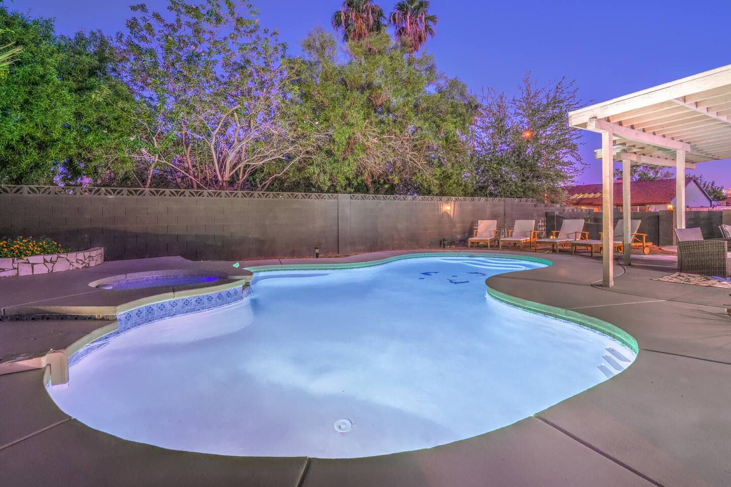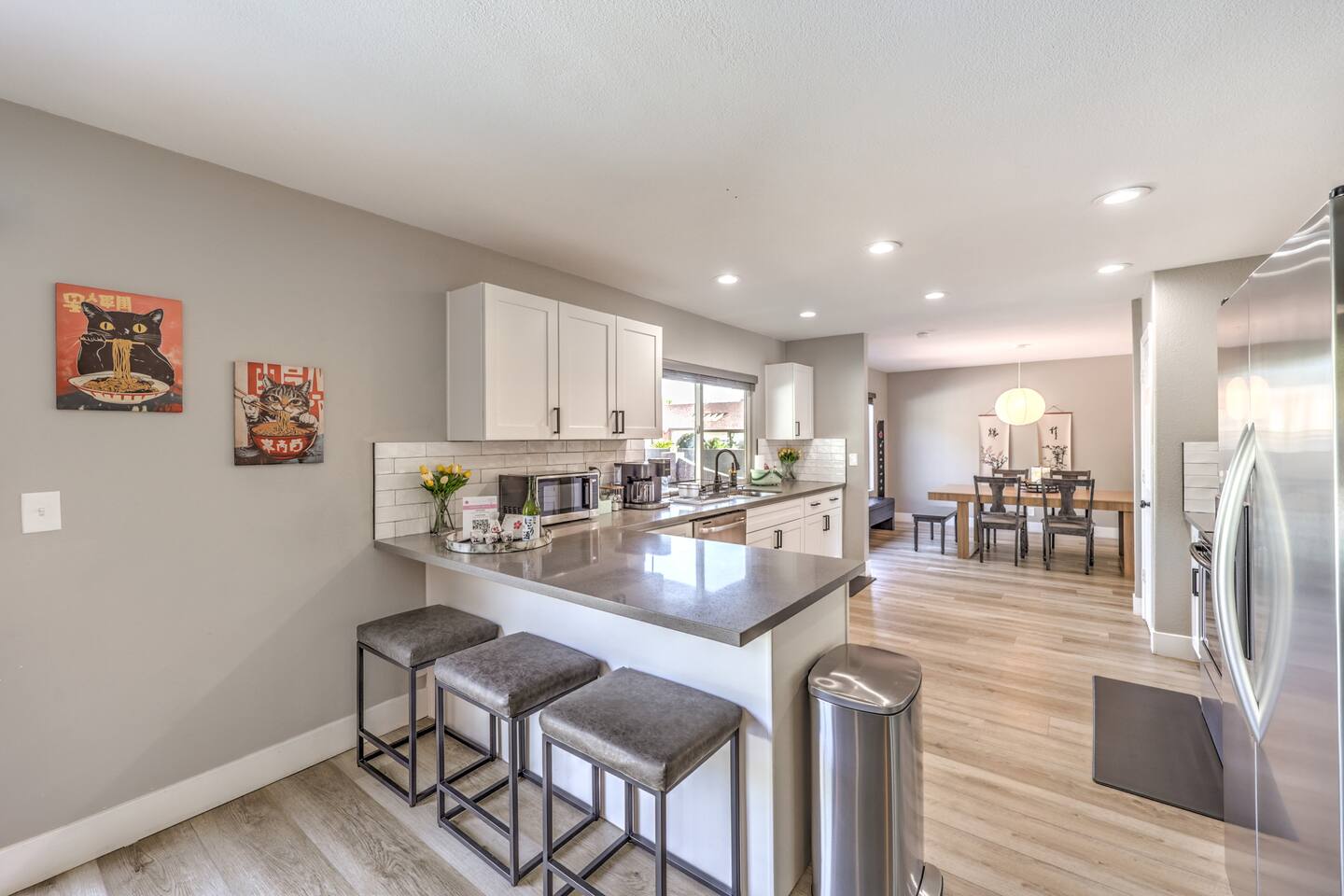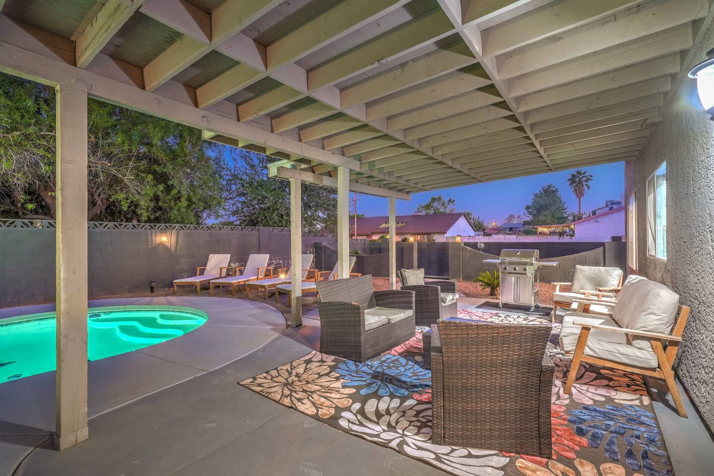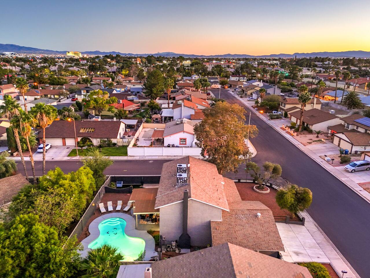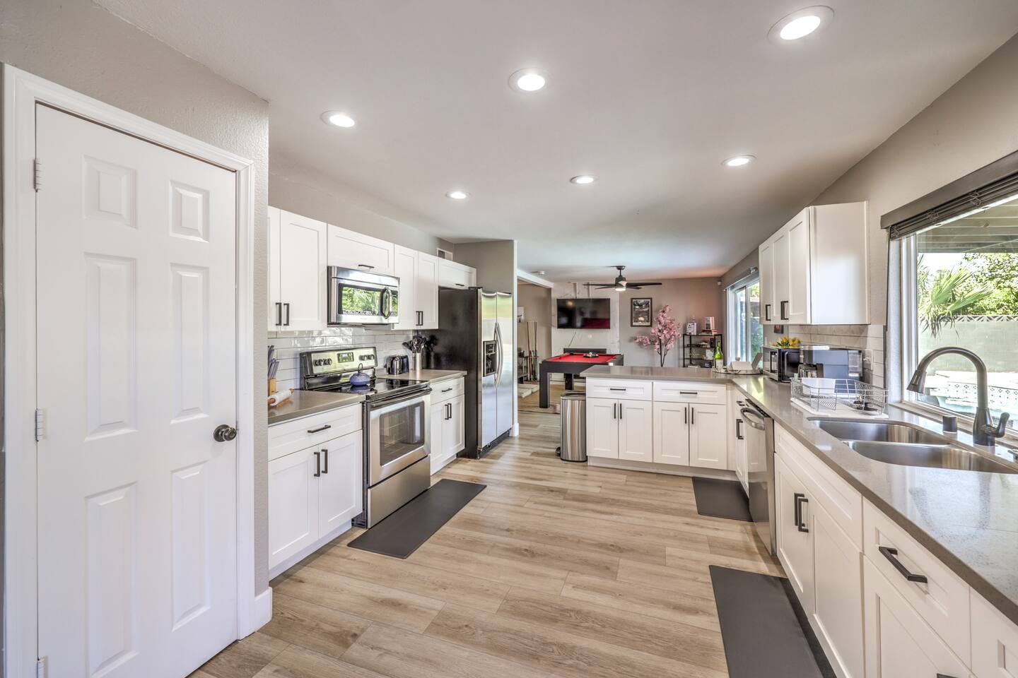🌸 Tokyo Escape 逃避 Your Modern Las Vegas Retreat Step into Tokyo Escape, a one-of-a-kind Las Vegas sanctuary inspired by the serenity of Japan and the vibrancy of Tokyo nightlife. Designed for families, friends, and groups, this four-bedroom home blends modern luxury with peaceful zen energy — complete with a heated pool & spa, open living spaces, and a dog-friendly outdoor area for your furry companions. ✨ Highlights 2,163 sq ft of thoughtfully designed living space 4 bedrooms | 2.5 bathrooms | 8 beds | Sleeps up to 10 Modern kitchen with stainless steel appliances Japanese tea room for meditation, relaxation, or a casual billiards match — complete with Smart TV Family room with large sectional and 75" Smart TV for movie nights Private heated pool & spa with lounge chairs + covered patio (Ask about pool heating or jacuzzi options) Fenced dog run and relief area – pet-friendly with approval In-home washer & dryer for extended stays Free parking + RV space Minutes from The Strip & Las Vegas Chinatown (150+ restaurants!) 🛏 Themed Rooms & Sleeping Arrangements: 1) The Shrine (Primary Suite): King bed + twin daybed, Smart TV, ensuite bath with double vanity & soaking tub — a true zen garden retreat. Kimonos provided for complimentary use. 2) Bedroom 2 – Shinjuku Suite: Queen bed with moody neon lighting for a sleek, Tokyo-style escape. 3) Bedroom 3 – Samurai Room: Twin-over-full bunk + kids’ play corner inspired by traditional Japan. 4) Bedroom 4 – Anime Room: Twin bed + twin trundle (2 beds) — playful and colorful with anime art. Fresh towels, toiletries & half bath on main floor provided. 🍹 Explore & Experience Just minutes away, explore the best of Las Vegas culture, cuisine, and entertainment: 🎰 Casinos & Shows: The STRAT, Wynn, Resorts World, Caesars, Bellagio & more 🌸 Food & Nightlife: Lotus of Siam, Tacos El Gordo, The Golden Tiki, Barry’s Downtown Prime 🏮 Las Vegas Chinatown: 150+ restaurants, markets & nightlife — only 5 minutes away 🎡 Family Fun: AREA15, Adventuredome, The Venetian gondolas 🌿 Your Escape Awaits Unwind in the heated spa, sip tea in the Tatami room, or enjoy a serene night under the stars. Tokyo Escape is where the tranquility of Japan meets the excitement of Las Vegas — the perfect balance of calm and connection.
