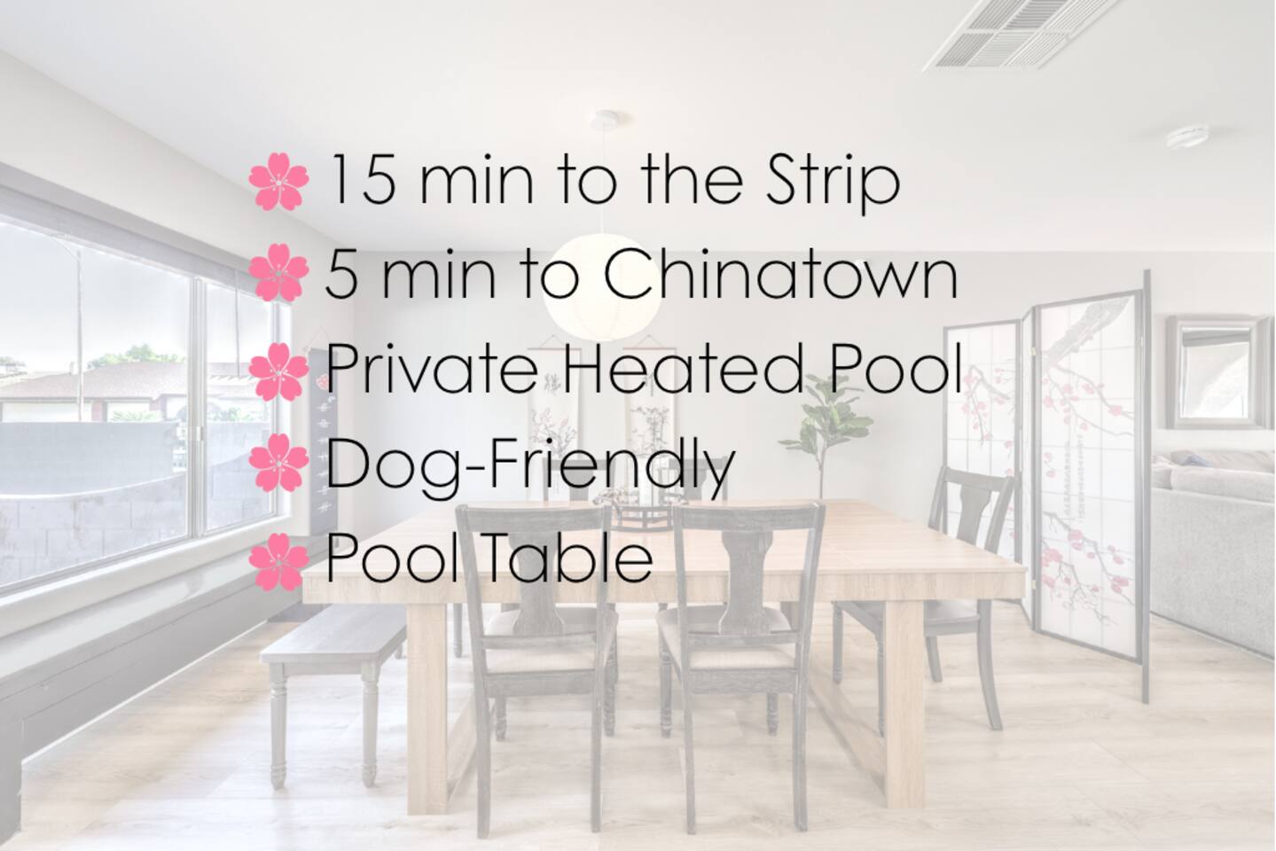🌸 2,163 sq ft | 200.9 sq meters 🌸 Sparkling heated pool & spa * 🌸 Dog run and dog house!* 🌸 4 separate bedrooms 🌸 2.5 bathrooms with essential toiletries 🌸 Spacious kitchen with stainless steel appliances 🌸 Japanese tea table and billiards room with fireplace 🌸 High-speed wifi throughout 🌸 Smart TVs 🌸 Washer & Dryer for Complimentary Use 🌸 Room to park RV/boat 🌸 Clark County STVR Lic # 200722 * $80 per night for pool heating gas cost * $500 pet fee for approved pets